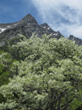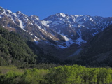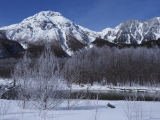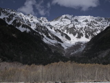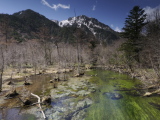 残雪の六百山と清流 長野県上高地明神にて 4月