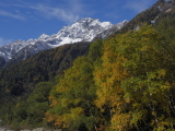 冠雪の明神と色づくダケカンバ 長野県上高地横尾にて 10月