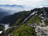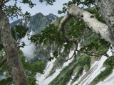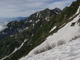 残雪の尾根を下る 北アルプス遠見尾根にて 7月
