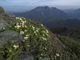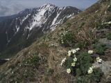 キタダケソウ咲く斜面と間ノ岳 南アルプス北岳にて 6月