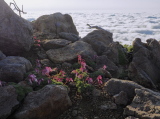 朝日に輝くコマクサと雲海 北アルプス乗鞍岳(富士見岳)にて 7月
